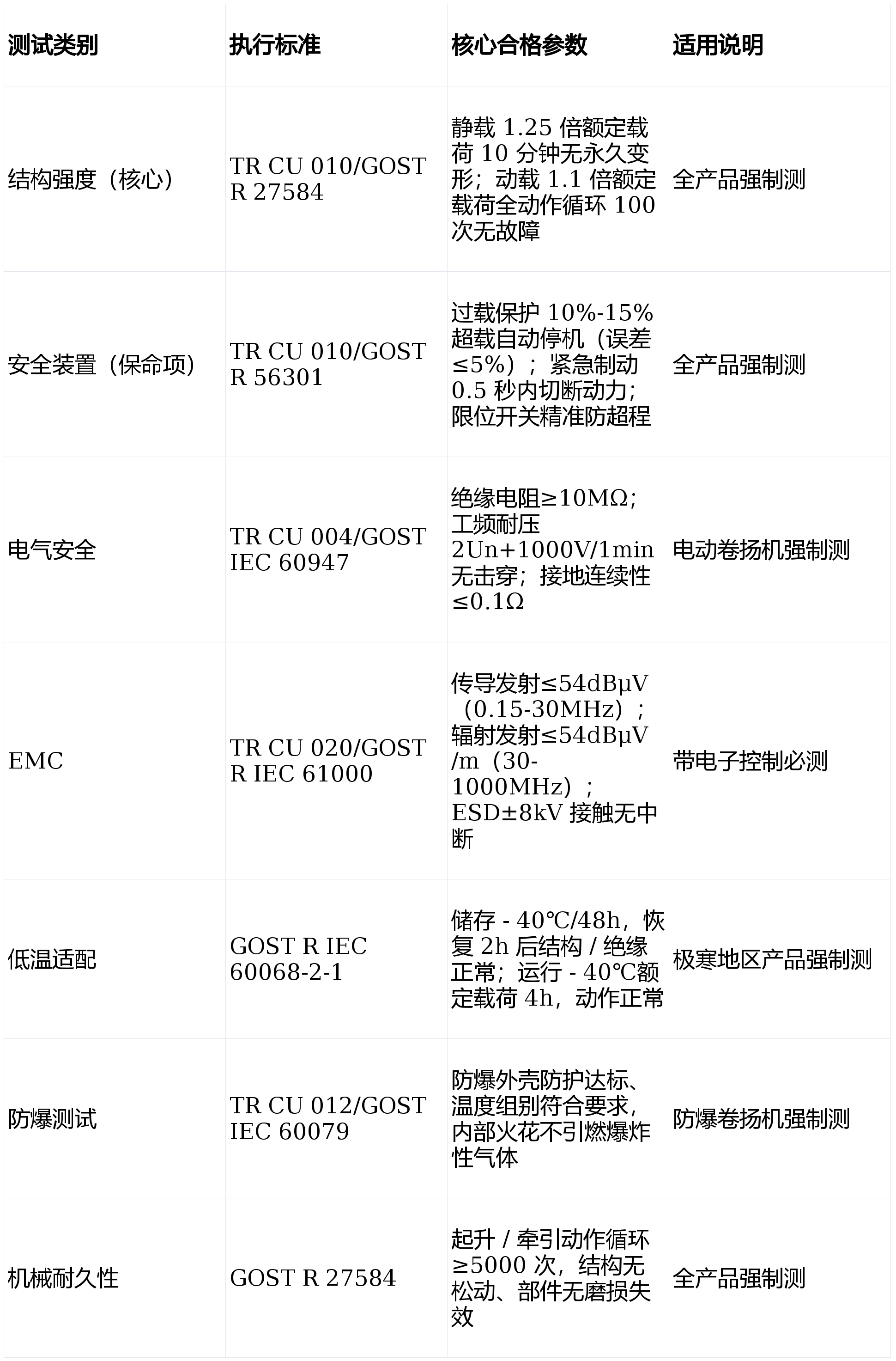 卷扬机 EAC(CUTR)认证是欧亚经济联盟(EAEU)市场准入的强制合规凭证,特殊标注:极寒产物标 “-40℃适配”,无效期 1-5 年(批量出产),沉点项:原材料采购验收尺度、环节件及格证明留存、测试设备校准证书(如载荷测试仪、耐压仪)、不及格品处置流程