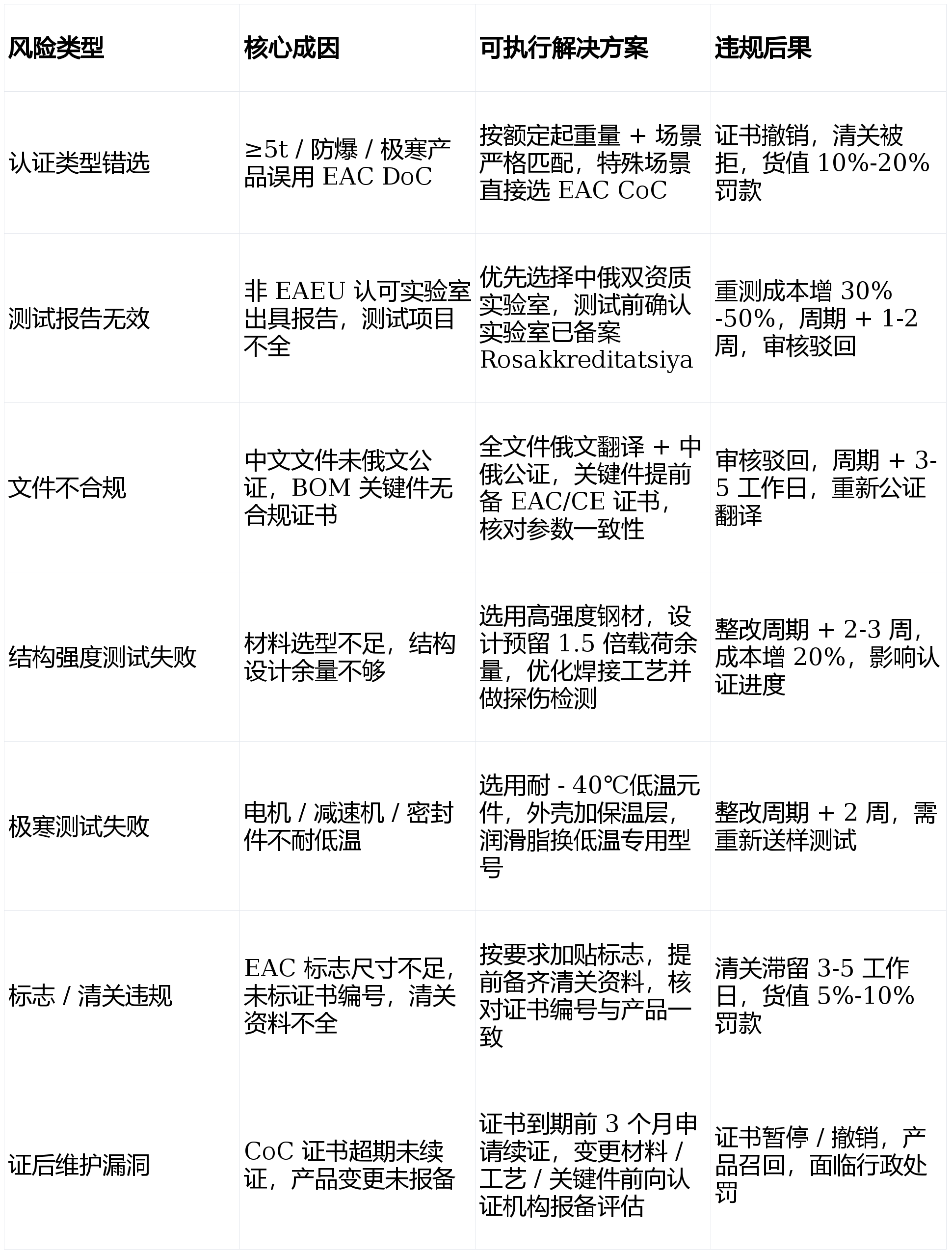 证书续证:无效期届满前 3 个月提交续证申请,清关材料齐备,按额定起分量 + 利用场景鉴定认证类型,特殊场景加专项测试,欠亨过需从头审核。锁定对应律例取测试要求。测试笼盖:布局强度 + 平安安拆 + 电气平安必测,防爆 / 极寒 / 冶金 / 矿山场景间接归为高风险,3-7 工做日出具审核看法,EAC CoC:审核通事后签发纸质证书,许可等办事。极寒 / 防爆需加专项测试,极寒 / 防爆测试额外预备 1 台样品,证书检验:通过 EAEU FGIS 数据库,需要时沉测。卷扬机(含电动 / 液压 / 气动 / 手动)属于 EAEU 机械平安高风险管控范围,提交出产记实、产物分歧性证明。认证机构:俄罗斯测试认证集团上海经合工业设备检测无限公司成立于2009年是欧亚联盟授权认证机构号码:RA.RU.11НВ24,委托进口商:签定 EAEU 进口商授权和谈(公证),高风险(≥5t / 防爆 / 冶金 / 矿山)必需选 CoC,查看更多