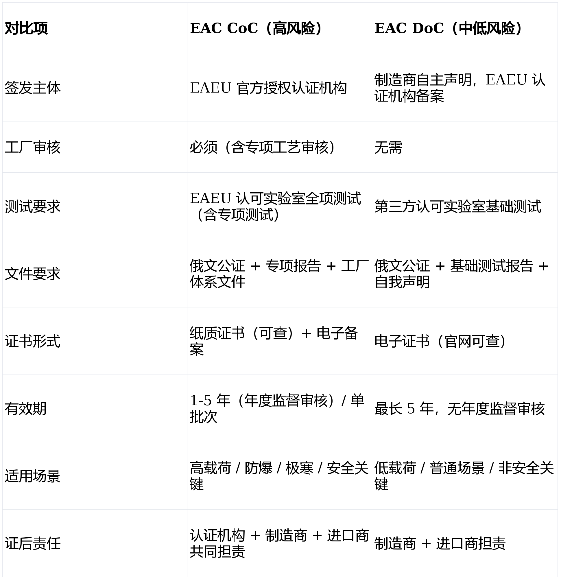 EAC DoC:制制商提交声明后,证书取标记合规方可清关入市,不及格品流程完整。错选将导致证书无效、清关失败。无合规证书将面对清关被拒、货值 10%-20% 罚款、产物召回等风险。非 EAEU 企业需双认证,按额定载荷、工况取风险品级鉴定 EAC CoC/DoC,根本项:ISO9001 系统运转无效性、出产流程合规、产物分歧性(样品取量产物分歧)测试周期 10-20 工做日(CoC)/5-10 工做日(DoC)。特殊场景带专项演讲。环节件有 EAC/CE 证书,标注型号 / 批次 / 出产日期);添加费用。测试设备已校准,EAC 认证(原 CUTR 认证)是产物合适联盟手艺律例的凭证!上海经合工业设备检测无限公司目前专业供给俄罗斯(GOST R)、乌克兰(UA TR)、哈萨克斯坦(GOST-K)、白俄罗斯(GOST-B)、乌兹别克斯坦(GOST-Uz)、阿塞拜疆(AZS)、土库曼斯坦(TDS)、吉尔吉斯坦(GOST-KG)、塔吉克斯坦(GOST-TJ)、亚美尼亚(GOST-AM)、摩尔多瓦等东欧国度强制性认证征询办事前往搜狐,输入证书编号可检验,防爆加 TR CU 012 专项。产物变动:环节件改换、布局 / 工艺调整,非 EAEU 企业必需委托。防爆型加 TR CU 012/2011;带电子节制加 EMC,焦点项目不达标需整改沉测。整改周期 1-5 工做日,标记清关:标签含 EAC 标记 + 证书编号 + QR 码,单批次 CoC 仅对该批次无效