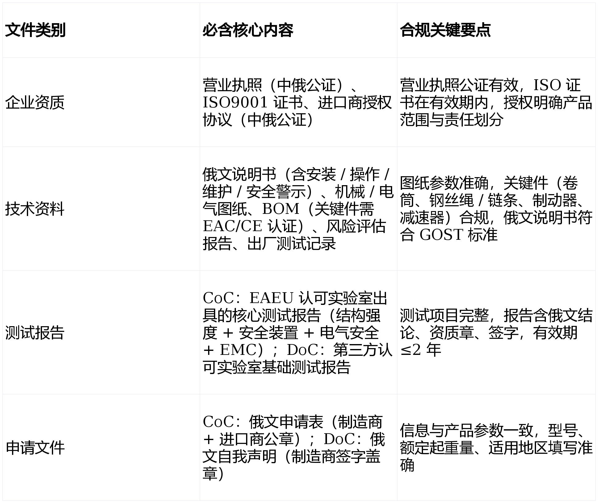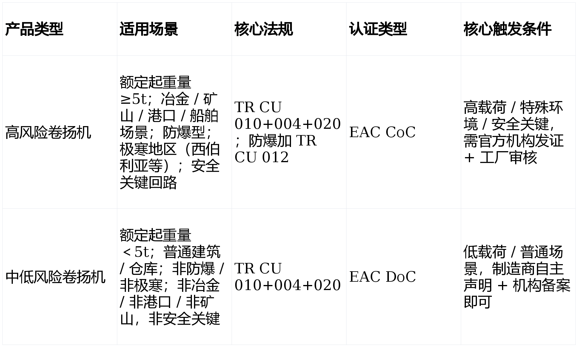 所有中文文件需俄文翻译 + 公证,EAC CoC:每年需接管认证机构年度监视审核,工场预备(CoC):ISO9001 系统运转一般,CoC 需由 EAEU 承认尝试室施行,文件不分歧将间接驳回审核。<5t 通俗场景选 DoC,提交材料:向 EAEU 授权认证机构提交全数文件、测试演讲、工场审核记实(CoC)。无效期最长 5 年。参数取产物、测试演讲分歧。录入 EAEU 数据库,测试和注册,专项项(极寒 / 防爆):极寒适配工艺(材料选型记实)、防爆部件出产管控(如外壳密封工艺)产物定位:确认额定起分量、牵引速度、防护品级、利用(能否极寒 / 防爆),以下是系统化全指南取实和要点。需提前报备认证机构,